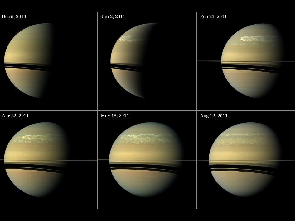 Esta serie de imágenes de la sonda espacial Cassini de la NASA muestra el desarrollo de la tormenta más grande vista en el planeta Saturno desde 1990. Estos son los colores reales y muestran la crónica de la tormenta desde su inicio, a finales de 2010 hasta mediados de 2011. Se puede apreciar claramente como la tormenta creció rápidamente pero con el tiempo se desvaneció dejando el rastro de lo impresionante que ha sido.La primera imagen de la tormenta, tomada el 05 de diciembre 2010, se encuentra en la parte superior izquierda del panel de imágenes. La tormenta sólo aparece como una pequeña nube blanca en el terminador, entre el lado diurno y el nocturno del planeta.